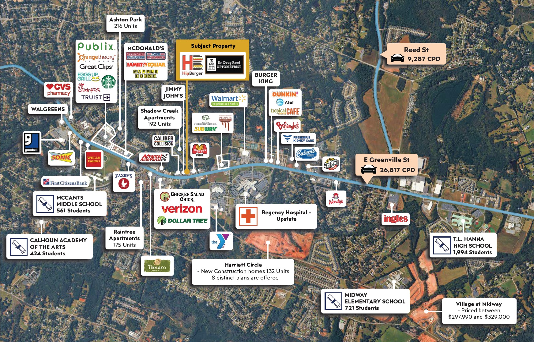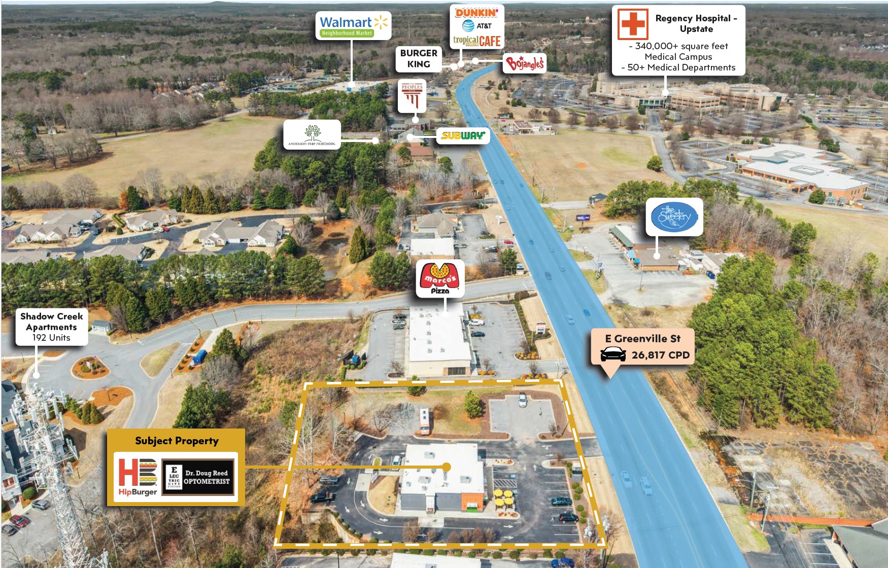 – Location is less than mile from AnMed North Campus with over 340,000 square feet of medical care and 50+ medical departments and less than mile from dominant retailers like McDonald’s,