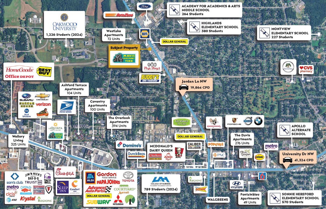 – The average rent/sf for single-tenant retail in the Huntsville, AL market is $19.27. With the three subject properties paying rents are $7.42/sf (Jordan), $11.67/sf (Memorial) and $13.45/sf (University), each of the sites are paying replaceable rents that are below market by a substantial margin.